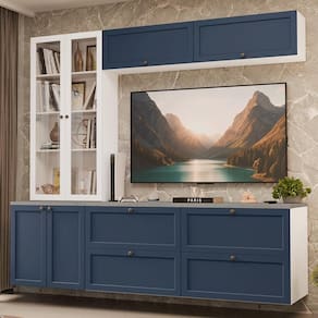 O conjunto é composto por gavetas e armários amplos, um armário com portas de vidro, que pode ser utilizado como cristaleira ou livreiro. Essa combinação permite acomodar uma TV, organizar livros, louças e itens decorativos com facilidade. O acabamento da estrutura é Branco, das frentes em Azul e da cristaleira em Branco também, possui alta resistência, trazendo um visual sofisticado e textura suave ao toque.