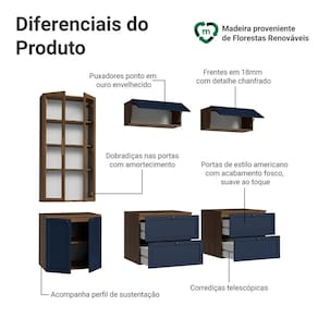 O conjunto é composto por gavetas e armários amplos, um armário com portas de vidro, que pode ser utilizado como cristaleira ou livreiro. Essa combinação permite acomodar uma TV, organizar livros, louças e itens decorativos com facilidade. O acabamento da estrutura é no tom amadeirado Rustic, das frentes em Azul e da cristaleira em Rustic também, possui alta resistência e textura suave ao toque.