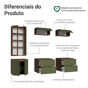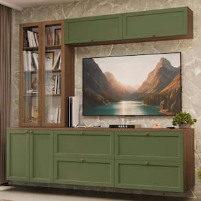 O conjunto é composto por gavetas e armários amplos, um armário com portas de vidro, que pode ser utilizado como cristaleira ou livreiro. Essa combinação permite acomodar uma TV, organizar livros, louças e itens decorativos com facilidade. O acabamento da estrutura é no tom amadeirado Rustic, das frentes em Verde e da cristaleira em Rustic também, possui alta resistência e textura suave ao toque.