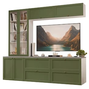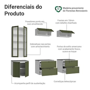 O conjunto é composto por gavetas e armários amplos, um armário com portas de vidro, que pode ser como cristaleira ou livreiro. Essa combinação permite acomodar uma , organizar livros, louças e itens decorativos com facilidade. O acabamento da estrutura é em Branco e das frentes em Verde, possui alta resistência, trazendo um visual sofisticado e textura suave ao toque.