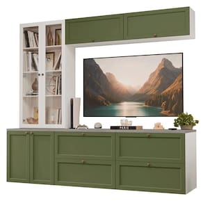 O conjunto é composto por gavetas e armários amplos, um armário com portas de vidro, que pode ser como cristaleira ou livreiro. Essa combinação permite acomodar uma , organizar livros, louças e itens decorativos com facilidade. O acabamento da estrutura é Branco, das frentes em Verde e da cristaleira em Branco também, possui alta resistência, trazendo um visual sofisticado e textura suave ao toque.
