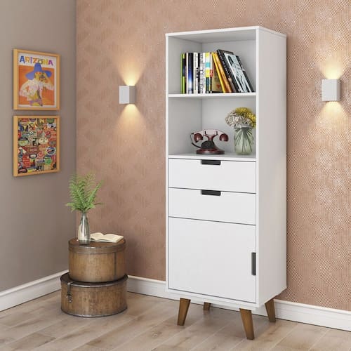 Esta é uma estante vintage com design diferenciado e prático onde poderá ser colocada em qualquer ambiente valorizando e dando personalidade. Possui duas prateleiras para colocar livros e objetos, duas gavetas em mdf com puxadores usinados e uma porta também em mdf com puxador usinado. O diferencial também são os pés vintage chanfrados em madeira envernizados. Os produtos da Olivar Móveis não servem apenas para preencher os espaços da sua casa, mas sim para transformar em um lugar aconchegante, atraente e com um design moderno, sem abrir mão da qualidade.