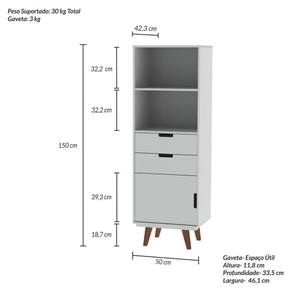 - Material: Mdp e Mdf - Quantidade de Prateleiras: 2 - Quantidade de Portas: 1 - Quantidade de Pés: 4 - Quantidade de Gaveta: 2 - Peso do Produto Montado: 346 - Peso Máximo Suportado: 30 - Medida do Produto Montado (LXCXA): 42cmx55cmx161,8cm - Acabamento: Pintura UV - Escala de Brilho: Acetinado - Material da Estrutura: MDP E MDF DE 15 E 25 mm - Produto Necessita de Montagem?: Sim - Tipo de Gaveta: Gavetas com corrediças deslizantes - Tipo de Pés: Pés Vintage 170mm em madeira envernizado - Tipo de Porta: Rotação - Tipo de Prateleira: Fixa - Recomendações de manutenção: Pano úmido. Não aplicar lustra móveis. - Volumes: 1 Volume - Garantia: 3 meses