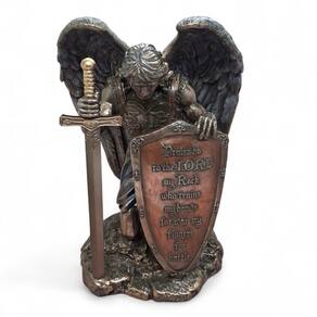 A estátua retrata o arcanjo ajoelhado em atitude de reverência, empunhando uma espada em uma mão e um escudo na outra, no qual está inscrito o versículo do Salmo 144:1: "Bendito seja o Senhor, minha rocha, que adestra minhas mãos para o combate e meus dedos para a guerra."