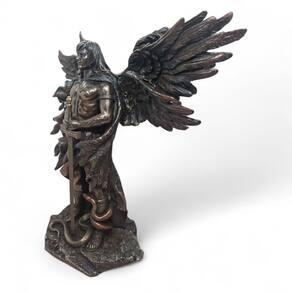 Ricamente detalhada, esta escultura transmite paz e reverência, com asas abertas em movimento e expressão serena. Ideal para quem busca proteção espiritual, elevação energética ou deseja compor um altar com presença angelical poderosa.