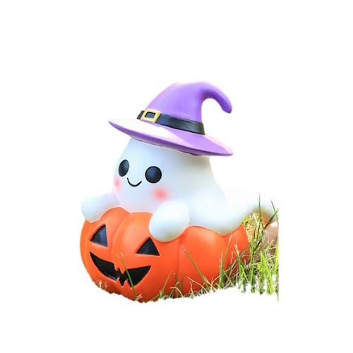 Material: Resina Tamanho: 11,3 cm × 11,3 cm × 14 cm Peso: 449,4 g ['Charmoso design de Halloween — Apresenta uma figura fantasma sorridente sentada em uma abóbora laranja e usando um chapéu de bruxa roxo, criando uma decoração divertida e festiva de Halloween para qualquer ambiente. ', 'Material de resina de alta qualidade — Feita de resina durável com textura suave e cores brilhantes, esta escultura é resistente às intempéries e ideal para uso interno e externo. ', 'Tamanho decorativo perfeito — Medindo 11,3 × 11,3 × 14 cm e pesando 449,4 g, esta estátua é compacta, mas atraente, adequada para mesas, gramados, jardins ou pátios. ', 'Cores brilhantes e alegres — A combinação vívida de branco, laranja e roxo adiciona uma atmosfera animada à sua coleção de ornamentos de Halloween ou à decoração de outono. ', 'Peça de exibição versátil — perfeita para decorar jardins, varandas, prateleiras ou escritórios, esta figura de fantasma e abóbora traz alegria e personalidade à sua decoração sazonal.']