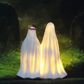 Material: Resina Tamanho: 9* 5* 9,8 cm Peso: 120 g ['Charming Couple Ghost Design — Esta escultura de resina apresenta um lindo casal fantasma de noivos segurando flores com iluminação LED suave, adicionando um toque romântico e assustador à sua decoração de Halloween. ', 'Built-in Warm LED Glow — A luz LED integrada cria um brilho suave e convidativo através da resina translúcida, tornando-a ideal para displays noturnos de jardim ou iluminação ambiente interna. ', 'Construção durável em resina — Feito de resina de alta qualidade, este enfeite de jardim é resistente às intempéries, à prova de desbotamento e perfeito para uso duradouro em ambientes internos ou externos. ', 'Detalhes artesanais — Cada figura é delicadamente pintada à mão, com texturas fantasmas realistas, detalhes florais e um acabamento suave e brilhante para um visual festivo elegante. ', 'Tamanho compacto para exibição versátil — Medindo 9 × 5 × 9,8 cm e pesando 120 g, esta estátua cabe facilmente em prateleiras, pátios, mesas ou gramados como uma deliciosa decoração de jardim de Halloween.']