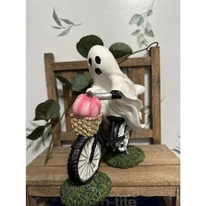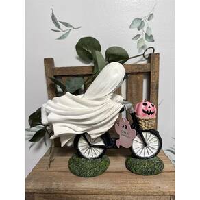 Material do produto: resina Tamanho do produto: 20* 20* 5 cm Peso: 285g ['Creative Ghost on Bicycle Design — Esta escultura de resina mostra um fantasma branco brincalhão andando de bicicleta com uma cesta de guloseimas, trazendo um toque extravagante e festivo de Halloween ao seu jardim ou casa. ', 'Material de resina de alta qualidade — Feito de resina durável, este enfeite de jardim é resistente às intempéries, à prova de desbotamento e projetado para resistir às condições externas e proporcionar uma beleza duradoura. ', 'Perfeita para exibição em ambientes internos e externos — Adequada para decoração de pátio, gramado, quintal ou mesa, esta figura adiciona uma atmosfera divertida e encantadora ao Halloween ou às decorações de jardim do dia a dia. ', 'Detalhes requintados pintados à mão — A capa lisa e fluida do fantasma, a bicicleta preta e a cesta colorida são cuidadosamente pintadas para criar uma peça decorativa vívida e realista. ', 'Tamanho decorativo ideal — Medindo 20 × 20 × 5 cm e pesando 285 g, esta escultura é compacta, mas atraente, facilitando a colocação em prateleiras, gramados ou jardins.']