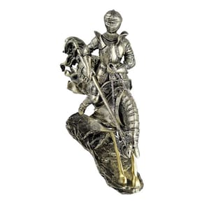 Estatua De Resina Cavaleiro Medieval A Estátua de Resina de um Cavaleiro Medieval é uma peça impressionante que retrata a nobreza e a coragem dos guerreiros da Idade Média. Esculpida com detalhes meticulosos, esta estátua apresenta um cavaleiro montado em seu cavalo, vestindo uma armadura ricamente detalhada, adornada com delicados relevos. O cavaleiro segura uma lança com destreza, preparado para o combate. Feita de resina de alta qualidade, esta estátua é uma adição imponente para qualquer coleção de decoração medieval.