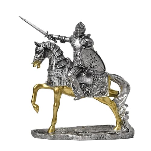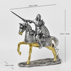 Material: resina sintética Tamanho do produto: 25 cm/9,8 pol* 27 cm/10,6 pol* 7,5 cm/2,9 polegadas Peso do produto: 700 g Design detalhado de cavaleiro a cavalo — Apresenta um cavaleiro medieval totalmente blindado segurando uma espada e um escudo enquanto monta um cavalo de criação, simbolizando coragem e honra. Construção em resina premium — Feita de resina durável com detalhes finos de pintura metálica, proporcionando um acabamento realista e de alta qualidade que aprimora seu apelo visual. Tamanho grande e impressionante — Com 10,6 polegadas de altura, esta escultura faz uma declaração ousada em mesas, prateleiras ou cornijas, perfeita para decoração em estilo medieval ou europeu. Perfeita para entusiastas da história — Ideal para fãs de história medieval, cavaleiros ou cavalaria, esta estatueta traz uma sensação de aventura e charme histórico ao seu espaço. Decoração versátil para casa ou escritório — Adequado para salas de estar, escritórios, estudos ou entradas, este ornamento serve como uma peça central impressionante ou para iniciar uma conversa.