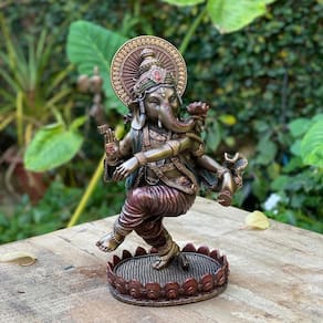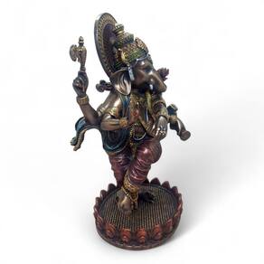 Ganesha, o deus hindu com cabeça de elefante, é conhecido como o removedor de obstáculos, patrono das artes e da inteligência. Em sua forma dançante, ele representa o equilíbrio entre o corpo e o espírito, a fluidez da vida e a celebração da existência mesmo em meio aos desafios.