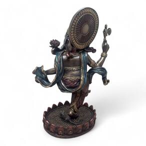 Características do Produto: Altura: 21 cm Material: resina premium Acabamento: Pintura artesanal com detalhes ricos em dourado, cobre e tons terrosos Estilo: Arte indiana tradicional Indicações: Decoração espiritual, altares hindus, prática de yoga e meditação, presente simbólico