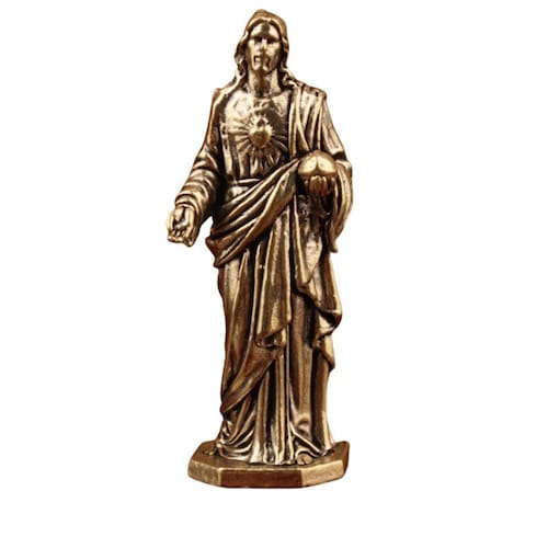 Material: latão Peso: 100 g Tamanho: 2 cm × 5,8 cm Design do Sagrado Coração — Estátua de latão representando Jesus com manto detalhado, símbolo de coração radiante e orbe, representando fé e devoção. Material de latão premium — Feito de latão sólido com acabamento dourado antigo, durável e resistente ao desbotamento, ideal para exibição a longo prazo. Tamanho compacto — mede aproximadamente 5,8 cm/2,28 polegadas de altura, é leve e portátil, adequado para prateleiras, mesas ou pequenos altares. Escultura artística — apresenta detalhes finos nas dobras do manto e na expressão facial, destacando a arte religiosa tradicional. Ornamento decorativo — Uma estatueta significativa que complementa espaços espirituais, cantos de meditação ou como uma escultura em miniatura colecionável.