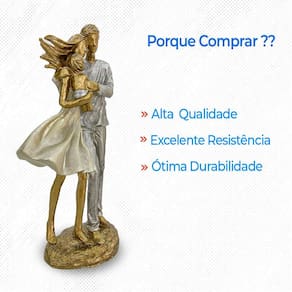 Descrição do produto: uma peça encantadora que simboliza o amor, a união e a alegria da família Com delicadeza e riqueza de detalhes, a escultura retrata um casal em um momento de ternura e proteção, segurando seu bebê com carinho e cuidado. A suavidade das formas e a expressão serena dos personagens transmitem uma sensação de aconchego, segurança e afeto. feita em resina de alta qualidade, a peça é resistente e apresenta um acabamento sofisticado, tornando-a uma lembrança eterna dos momentos mais preciosos da vida.