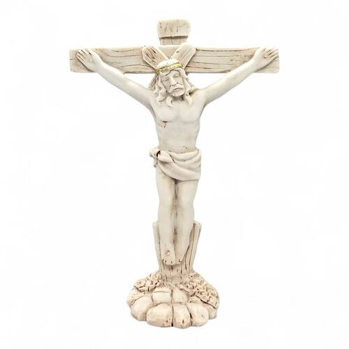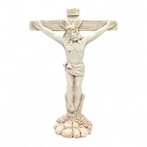 Estatueta de Resina Branca – Jesus na Cruz 15 cm Símbolo de fé, proteção e espiritualidade no seu lar.