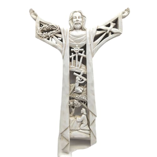 Tamanho: 21 x 14 x 1,5 cm Material: resina Peso do produto: 300 g Design inspirador — Apresentando Jesus de braços abertos e detalhes simbólicos, incluindo cruz, coroa de espinhos e cenas de oração, criando uma escultura cristã significativa para demonstração de fé. Artesanato detalhado — Estatueta de resina feita à mão com finos elementos esculpidos e acabamento texturizado, destacando o simbolismo espiritual e os detalhes artísticos. Material de resina durável — Feito de resina de alta qualidade, leve e resistente, garantindo o uso duradouro como ornamento espiritual em ambientes domésticos ou religiosos. Display suspenso na parede — Projetado com uma parte traseira plana para facilitar a montagem nas paredes, ideal para salas de estar, cantos de oração, capelas ou espaços de meditação. Ornamento Sagrado Cristão — Perfeito como uma escultura decorativa que inspira reflexão, trazendo uma sensação de paz, fé e devoção a qualquer espaço religioso.