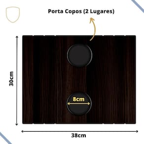 Dimensões: 38cm x 30cm Corte à laser - extrema qualidade e acabamento; Fabricado com 100% madeira de reflorestamento; Design moderdo e elegante; Por ser flexível se adapta à qualquer braço de sofá; 2 porta copos;