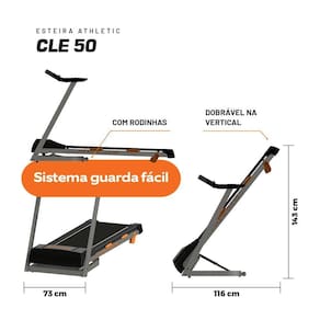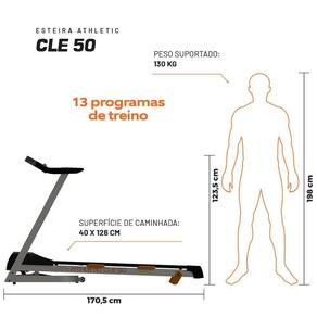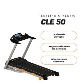 Especificações TécnicasProduto: Esteira Elétrica Athletic CLE 50Marca: AthleticModelo: Athletic CLE 50Linha: ResidencialIndicado para Uso: ResidencialVelocidade Mínima: 1 km/hVelocidade Máxima: 16 km/hPotência do Motor: 5.0 HPMTipo do Motor: Corrente contínua DCSuperfície de Caminhada/Corrida: 40 x 128 cmSistema de Inclinação: Com 12 níveisTipo de Inclinação: EletrônicaProgramas de Treino: 13 programasAmortecedores: 8 amortecedores (4 amortecedores centrais + 4 amortecedores nas extremidades)Dobrável: Sim (com sistema Guarda-Fácil vertical)Peso Máximo Suportado pelo Usuário: 130 kgFunções do Monitor: 21 Funções (Velocidade, Inclinação, Tempo, Distância, Calorias, Batimentos Cardíacos, ODO, Total Time, Sleep, Gráfico Programa, Circuito, Acesso Velocidade rápida, Inclinação rápida, Aquecimento, Desaceleração, THR, IMC, Recuperação pós treino, Programação Contagem Regressiva Cal/Dis/Time)Sensor de Batimentos Cardíacos: Sim (Sistema Hand Grip)Display: LCD blue backlightAlimentação do Monitor: Via cabo de energiaTeclas de Atalho: No monitor (6 teclas de atalho de velocidade e 6 teclas de atalho de inclinação)Porta Objetos: SimSistema de : Chave de para parada de emergência, lona antiderrapante e carenagem de proteção no motorLona: Fácil de ajustarPlataforma: Em MaDeFibra BP laminado melamínico de 18mm com maior qualidade e durabilidade mais longa e acabamento com resina especialLubrificação: Manual (aplicação fácil, usar silicone específico)Tipo de Exercício: Aeróbico, Condicionamento Físico, Resistência, HIIT, Fortalecimento Muscular, Perda de PesoPartes do Corpo Trabalhadas: Pernas, Costas, Abdominais e GlúteosExercícios Possíveis: Caminhadas, trotes e corridasTamanho: ÚnicoCor: Cinza e PretoVoltagem: BivoltEstrutura: Aço carbonoPintura: Eletrostática a pó, alta resistência a corrosãoDimensões Aproximadas Montada (A x L x C): 123,5 x 73,2 x 170,5 cmPeso Líquido: 45 kgComposição: Aço, MaDeFibra e PlásticoCuidados com o Produto: Manter a lubrificação em dia, a limpeza deve ser feita com pano úmidoGarantia: 1 ano (Consultar o manual)Assistência Técnica: A Athletic possui uma rede de assistência técnicaMontagem: Fácil (sistema de montagem easy fast)Condição do Produto: NovoItens da Caixa: 1 Esteira ergométrica, 1 chave de , 1 manual do usuário, 1 Kit de montagemDimensões Embaladas (A x L x C): 33 x 83 x 177 cmPeso Embalada: 55 kgFabricante: Athletic