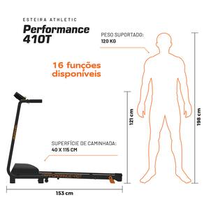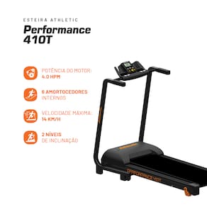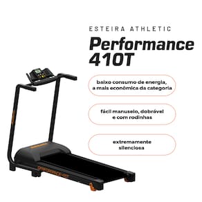 A Esteira Ergométrica Athletic Performance 410T é um equipamento elétrico desenvolvido para uso residencial, indicado para atividades como caminhadas, trotes e corridas leves, conforme as especificações do fabricante.