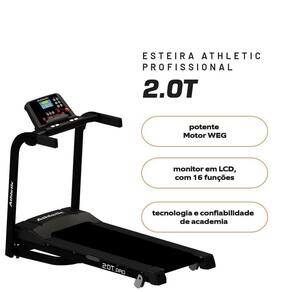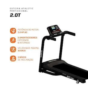 Especificações TécnicasProduto: Esteira Ergométrica Athletic 2.0TMarca: AthleticModelo: 2.0TLinha: SemiprofissionalIndicado para Uso: Residencial, Condomínio, Construtoras, Studio e HotéisTipo de Esteira: Elétrica, DobrávelVelocidade Mínima: 1 km/hVelocidade Máxima: 16 km/hPotência do Motor: HPTipo do Motor: Corrente Alternada AC (Motor WEG)Superfície de Caminhada/Corrida: 40 x 128 cmSistema de Inclinação: Com 2 níveisTipo de Inclinação: ManualProgramas de Treino: 26 programasAmortecedores: 8 Amortecedores InternosDobrável: Sim (com sistema Guarda-Fácil vertical)Peso Máximo Suportado pelo Usuário: 130 kgFunções do Monitor: 16 Funções (Velocidade, Tempo, Distância, Calorias, Batimentos Cardíacos, ODO, Scan, Sleep, Gráfico Programa, Acesso Velocidade rápida, THR, IMC, Recuperação pós treino, Programação Contagem Regressiva Cal/Dis/Time)Sensor de Batimentos Cardíacos: Sim (Sistema Hand Grip)Display: LCD blue backlightAlimentação do Monitor: Via cabo de energiaTecla de Atalho: No monitor (6 teclas de atalho de velocidade)Porta Objetos: SimSistema de : Chave de para parada de emergência, lona antiderrapante e carenagem de proteção no motorLona: Fácil de ajustarPlataforma: Em MaDeFibra BP laminado melamínico de 18mm com acabamento com resina especialLubrificação: Manual (aplicação fácil, usar silicone específico)Tipo de Exercício: Aeróbico, Condicionamento Físico, Resistência, HIIT, Fortalecimento Muscular, Perda de PesoPartes do Corpo Trabalhadas: Pernas, Costas, Abdominais e GlúteosExercícios Possíveis: Caminhadas, trotes e corridasTamanho: ÚnicoCor: EscuroEstrutura: Aço carbonoPintura: Eletrostática a pó, alta resistência a corrosãoDimensões Aproximadas Montada (A x L x C): 123 x 73 x 170 cmPeso Líquido: 42,4 kgComposição: Aço, MaDeFibra e PlásticoCuidados com o Produto: Manter a lubrificação em dia, a limpeza deve ser feita com pano úmidoGarantia: 1 ano (Consultar o manual)Assistência Técnica: A Athletic possui uma rede de assistência técnicaMontagem: Fácil (sistema de montagem easy fast)Condição do Produto: NovoItens da Caixa: 1 Esteira ergométrica, 1 chave de , 1 manual do usuário, 1 Kit de montagemDimensões Embaladas (A x L x C): 33 x 83 x 177 cmPeso Embalada: 46,8 kgFabricante: AthleticRodas para : Sim (duas rodas dianteiras)Voltagem: 110 ou 220 (escolher no ato da compra)