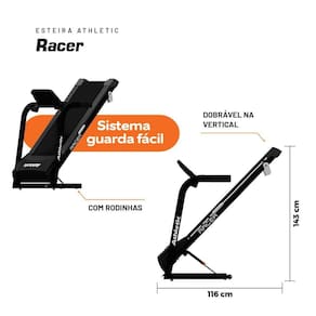Pensando na praticidade, a Esteira Athletic Racer é fácil de guardar. Conta com sistema guarda-fácil vertical e rodinhas para facilitar o e o armazenamento em qualquer espaço, sem esforço e sem precisar de ajuda. Sua estrutura em aço carbono com pintura eletrostática a pó de alta resistência à corrosão e a plataforma em MaDeFibra BP de 18mm garantem a durabilidade e a qualidade do equipamento. A lona é fácil de ajustar e a lubrificação manual é simples (usando silicone específico).