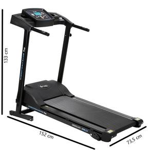- Possui monitor em LED com 5 janelas e funções, sendo elas: tempo, velocidade, distância, calorias e batimentos cardíacos. Tem 3 níveis de inclinação, 4 programas pré-definidos de velocidade. É dobrável e possui rodinhas para transporte.