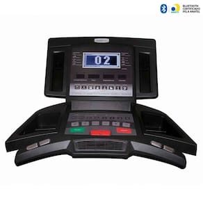 Painel completo e intuitivo que exibe: calorias, velocidade, tempo, distância, inclinação e batimentos cardíacos (medidos através do hand grip na barra frontal). Ela também possui conexão Bluetooth com certificação da Anatel, compatível com Apps de treino.