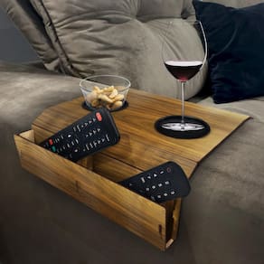 Dimensões: 38cm x 30cm Corte à laser - extrema qualidade e acabamento; 2 porta copos; 2 nichos para guardar controles, celulares, carregadores e demais objetos; Fabricado com 100% madeira de reflorestamento; Design moderdo e elegante; Por ser flexível se adapta à qualquer braço de sofá;