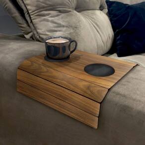 Dimensões: 38cm x 30cm Corte à laser - extrema qualidade e acabamento; 2 porta copos; 2 nichos para guardar controles, celulares, carregadores e demais objetos; Fabricado com 100% madeira de reflorestamento; Design moderdo e elegante; Por ser flexível se adapta à qualquer braço de sofá;
