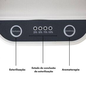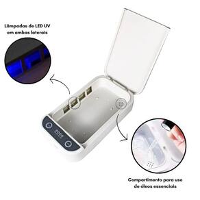 - Lâmpadas UV nas laterais, garantindo uma esterilização de 360 graus - Leve e portátil - Versátil, podendo ser usada para diversos objetos - Entrada extra para cabo USB - Difusor interno para uso de óleo essencial