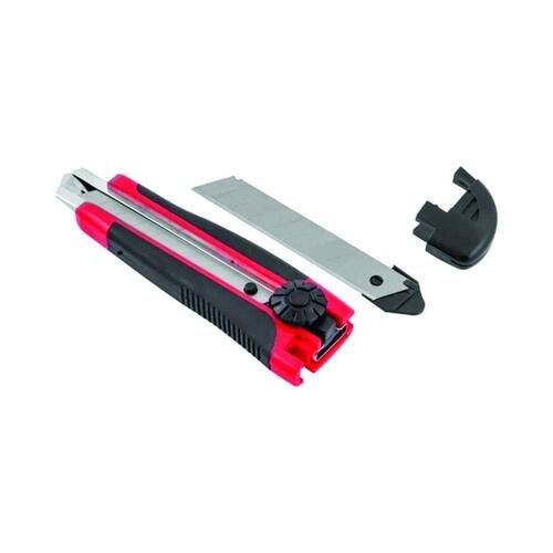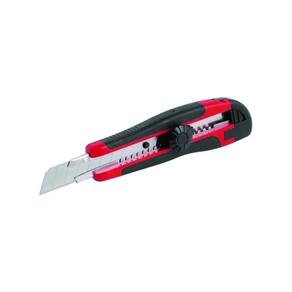 Possui corpo em plástico reforçado revestido com borracha termoplástica que confere maior conforto para o operador. Conta ainda com guia metálica e botão giratório que permite travar a lâmina facilitando o manuseio.