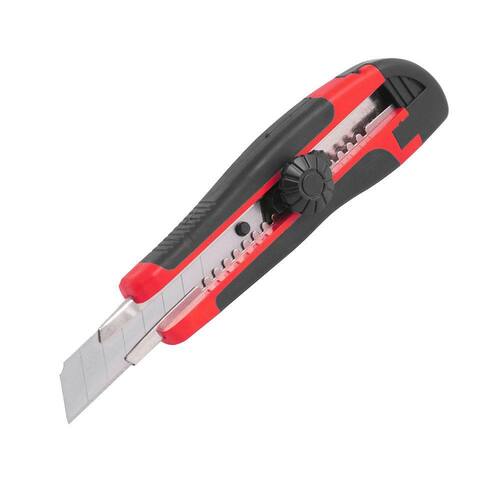 Possui corpo em plástico reforçado revestido com borracha termoplástica que confere maior conforto para o operador. Conta ainda com guia metálica, botão parafuso giratório, que permite travar a lâmina facilitando o manuseio, e compartimento com 1 lâmina sobressalente.