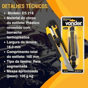 O Estilete Emborrachado 18mm Vonder Profissional ES-218 é a ferramenta ideal para profissionais que buscam precisão e conforto em seus cortes. Com uma lâmina segmentada de 18 mm, este estilete proporciona cortes limpos e eficientes, sendo perfeito para uma variedade de aplicações.
