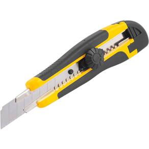 Indicado para fazer cortes em geral. Possui corpo em plástico reforçado revestido com borracha termoplástica que confere maior conforto para o operador. Conta ainda com guia metálica, botão parafuso giratório, que permite travar a lâmina facilitando o manuseio. Acompanha: 2 lâminas. Tipo da lâmina: Reta segmentada. Comprimento total do estilete: 6.1/2 165 mm . Largura da lâmina: 18,0 mm. Modelo: ES218.