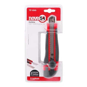 - Marca: Nove54; - Referência: 35.99.180.004; - Material do corpo do estilete: plástico revestido com borracha termoplástica; - Tipo da lâmina: reta segmentada; - Comprimento total do estilete: 6.1/2'' - 165 mm; - Largura da lâmina (mm): 18; - Conteúdo da embalagem: ?1 Estilete, acompanha 2 lâminas; - Garantia: 3 meses junto ao fabricante.