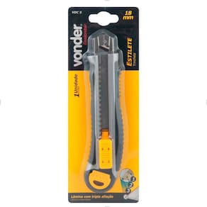 Ref.: 3599018005. Marca: Vonder. Acompanha: 5 lâminas com tripla afiação. Material do corpo do estilete: Metálico revestido com borracha termoplástica. Tipo da lâmina: Reta segmentada. Largura da lâmina: 18,0 mm. Comprimento total do estilete: 165 mm. Massa aproximada (peso): 0.245 kg.
