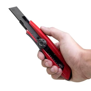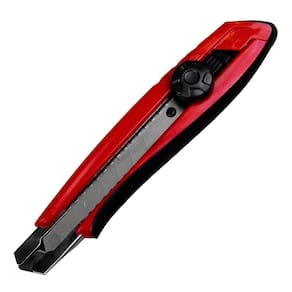 Estilete com corpo em plástico e emborrachado. Com guia para lâmina em metal. Trava de prarafuso. Lâmina larga de 18mm.