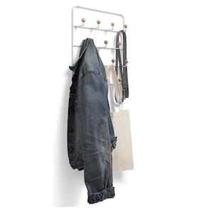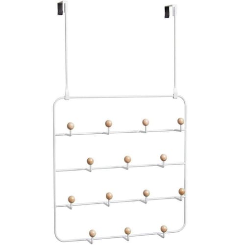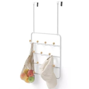 Design diferenciado e com linhas finas, a junção leve do branco + madeira, e claro, além de tudo isso é uma peça super útil pro dia a dia de uma casa: são 14 ganchos generosamente espaçados entre eles, dando espaço para acessórios de todos os tamanhos e formas, como blusas de frio, bolsas e lenços!