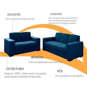Marca: MDM Estofado | Tipo de produto: Sofá | Quantidade de caixas de embalagem: 1 | Fabricante: MDM Estofado | Linha: Premium | Modelo: Roma | Material do estofamento: Espuma D-26 | Unidades por kit: 2 | Quantidade de lugares Sofá Maior: 3 | É reclinavel: Não | Orientação do Sofa: Não deixar exposto no sol, não molhar, evitar superficies quentes e objetos quentes em cima do produto | Material dos pés: Plástico | Cor dos pés: Tabaco | Quantidade de peças: 2 | Estilo: Moderno | Formato do sofá: Padrão | Materiais da estrutura: 100% REFLORESTADA (EUCALÍPITO), Chapa de compensado, Composto de espuma D-26 | Material do enchimento do encosto: Espuma | Densidade da espuma: 26 | é sofá cama: Não | Largura da cama: 0 | Unidade de largura da cama: Cm | Profundidade da cama: 0 | Unidade de profundidade da cama: Cm | Altura da cama: 0 | Unidade de altura da cama: Cm | Mecanismo de abertura do produto: Produto é fixo | Acessórios incluidos: Não | Requer montagem: Não | Peso máximo suportado: 120 | Unidade de peso máximo suportado: KG | Largura do colchão: 0 | Unidade de largura do colchão: Cm | Comprimento do colchão: 0 | Unidade de comprimento do colchão: Cm | Peso Sofá 3 lugares: 40.9 | Unidade de peso: Kg | Largura sofa de 3 lugares: 167 | Unidade de largura sofá 3 lugares: Cm | Profundidade sofá 3 lugares: 70 | Unidade de profundidade: Cm | Altura sofá 3 lugares: 77 | Unidade de Altura: Cm | Peso sofá 2 lugares: 23.9 | Unidade de peso sofá 2 lugares: Kg | Largura sofá 2 lugares: 122 | Unidade de largura sofá 2 lugares: Cm | Profundidade sofá 2 lugares: 70 | Unidade de profundidade sofá 2 lugares: Cm | Altura sofá 2 lugares: 77 | Unidade de altura sofá 2 lugares: Cm | Quantidade de lugares sofá menor: 2 Cor: AZUL
