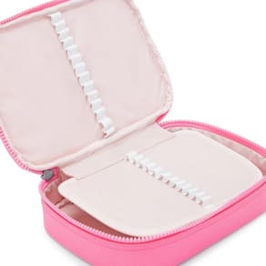 O 100 Pens é um estojo estruturado e espaçoso, com uma divisória central que possui elástico para acomodar lápis e canetas. O modelo é ideal para o dia a dia escolar ou até mesmo para guardar maquiagem.