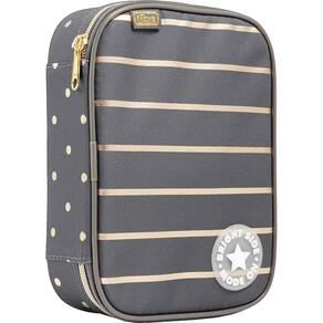 - Compartimentos: 01; - Detalhe em foil; - Divisória central; - Elástico para acomodar lápis e canetas; - Fechamento em zíper; - Formato: (L)150mm x (A)210mm x (P)60mm; - Com forro; - Material: poliéster e resistente; - Puxador em metal.