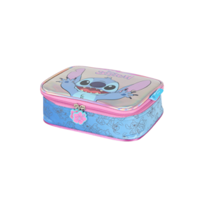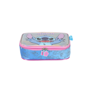 Design Exclusivo: Frente em material holográfico/iridescente que brilha e muda de cor. Detalhes Laterais: Estampa sutil do Stitch e padrões em fundo gradiente (degrade) azul e rosa. Tipo Box: Formato retangular e espaçoso para máxima capacidade de armazenamento. Compartimento Duplo: Dois zíperes principais independentes para uma organização superior de diferentes tipos de materiais. Zíperes Personalizados: Puxadores em formato de flor ou com a logo "Stitch", adicionando charme. Material: Confeccionado em Poliéster durável e de alta qualidade. Cores: Predominantemente rosa, azul e lilás com o efeito iridescente.