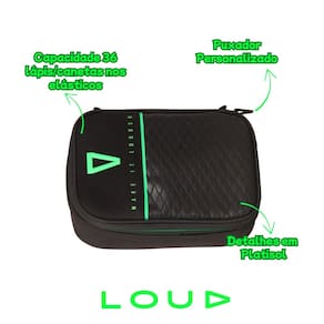 Estojo Escolar Box LOUD – Organização de respeito pro seu jogo render! Perfeito para quem curte estilo e praticidade, o Estojo Box LOUD tem espaço de sobra para tudo que você precisa! Com 36 elásticos internos, ele mantém lápis, canetas e outros itens bem organizados. Ideal para a escola, cursos ou onde a criatividade te levar! Com design inspirado na maior organização gamer do Brasil, é a escolha certa para quem quer destacar sua personalidade!