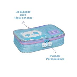 Características Estojo: - Confeccionado em poliéster - Frente com detalhe em PVC Holográfico - Puxadores de zíper personalizados - 36 elásticos para lápis/canetas