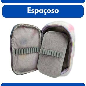 O outro lado do estojo possui um amplo espaço livre para objetos maiores como tesouras, colas, marca-textos, calculadora e outros materiais.