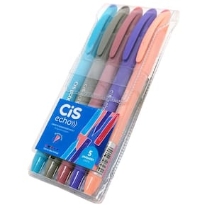 - O Estojo CiS ECHO traz 5 canetas esferográficas com escrita suave, moderna e perfeita para o dia a dia. - Cada caneta possui corpo em tons pastel e ponta agulha de 0.7mm, garantindo traços precisos e confortáveis para escrever, anotar ou desenhar. - Kit com 5 cores: azul, cinza, lilás, roxa e pêssego. - Ponta agulha 0.7mm: escrita fina, fluida e de ótima legibilidade. - Cores das tintas correspondentes ao corpo: fácil identificação e organização. - Estojo rígido reutilizável: ideal para levar na mochila ou deixar na mesa. - Design pastel moderno: combina estilo e funcionalidade. - CiS: marca reconhecida pela qualidade e durabilidade de seus materiais escolares e de escritório.