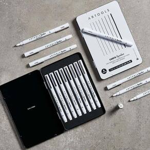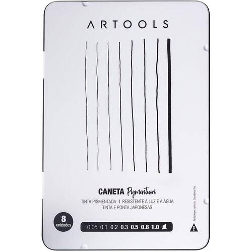 Com traço intenso e de alta pigmentação preta, a caneta PIGMENTUM foi desenvolvida com tinta japonesa, resistente à ação da luz e da água. Sua ponta firme proporciona uso prolongado do material. O estojo vem em uma lata elegante e prática, que inclui 8 diferentes traços conforme graduações: 0,05mm, 0,1mm, 0,2mm, 0,3mm, 0,5mm, 0,8mm, 1,0mm e chanfrada reta.