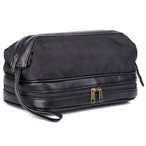 O exterior durável de nylon com detalhes em couro vegano Super Travel Kit com itens extras apresenta um zíper superior, uma grande abertura, zíper interno e bolso deslizante e um compartimento inferior com zíper que contém um conjunto de manicure de 5 peças composto por tesoura, pinça, lixa de unhas, cortador de unhas e ferramenta combinada. A parte inferior também inclui 3 frascos recarregáveis compatíveis com TSA, escova de dentes e bolsa de malha removível.