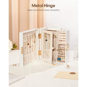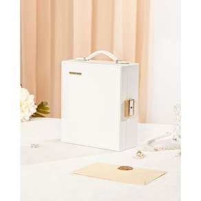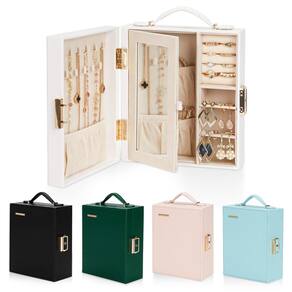 Caixa de joias de viagem Material externo: couro sintético Material interno: veludo Material da camada intermediária: MDF Público-alvo: meninas ou mulheres Tamanho do produto: 19 cm x 16 cm x 7 cm Cores disponíveis: branco, preto, azul, verde escuro, rosa claro Uso do produto: Armazenamento de brincos, pregos, colares, anéis e outros itens de joias - Caixa de joias exclusiva projetada para viagens: ao contrário das caixas de joias comuns no mercado, esta caixa de joias é projetada especificamente para viagens. Você pode carregar esta caixa de joias enquanto caminha pelas ruas da cidade ou estradas rurais. Também pode ser colocado em uma mala de viagem, adicionando elegância às suas viagens. Além disso, pode ser colocado na penteadeira de um quarto de hotel, proporcionando conveniência para você se vestir - Não há necessidade de comprometer sua seleção de joias, pois o grande organizador de joias de viagem permite que você traga uma quantidade substancial de joias: este organizador de joias de três camadas oferece amplo espaço de armazenamento, permitindo que você guarde muitas joias para sua viagem. A primeira camada inclui 11 ganchos de colar, capazes de segurar pelo menos 11 colares. A segunda camada possui um espelho no lado esquerdo para você se vestir bem e 7 ganchos de colar no lado direito. A terceira camada contém 2 bolsas de pulseira, 2 cartões de brinco removíveis e 4 linhas para anéis, acomodando relógios, pulseiras, pulseiras, brincos, brincos de orelha, anéis, grampos de cabelo, laços de cabelo, etc. - Material de longa duração para viagens repetidas: este armazenamento de joias é feito de couro sintético de longa duração, garantindo uso duradouro. O forro interior macio oferece excelente proteção para seus acessórios de joias. Ao contrário das caixas de joias comuns, esta caixa de joias possui dobradiças de metal para abertura e fechamento mais suaves - Detalhes atenciosos para um elegante suporte de joias de viagem: o cadeado de metal protege suas joias de crianças e animais de estimação. A alça resistente permite fácil transporte durante viagens. Oferecemos uma variedade de cores, incluindo branco, preto, azul, verde escuro, rosa claro, oferecendo mais opções - Um presente maravilhoso para entusiastas de viagens: Tamanho: 19 x 16 x 7 cm. Adequada para meninas ou mulheres, esta caixa de joias é um ótimo presente para ocasiões como Dia dos Namorados, Dia das Mães, Natal, aniversários, casamentos, formatura, aniversário, etc. É perfeito para dar à sua namorada, esposa, mãe, amigas, colega ou professora que adora viajar