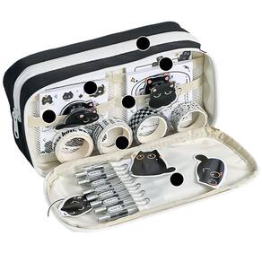 Material: Peso do tecido: 89 g Tamanho: 220 mm* 70 mm* 120 mm Design moderno de cordão Possui um elegante fecho de cordão duplo para fácil acesso e uma aparência única, oferecendo funcionalidade e elegância para o uso diário. Armazenamento de alta capacidade Possui 9 compartimentos para organizar perfeitamente canetas, lápis, borrachas e pequenos itens de papelaria, perfeitos para material escolar ou de escritório. Construção em tecido durável Feito de tecido durável de alta qualidade, garantindo que o estojo de lápis permaneça resistente e leve para uso diário, ao mesmo tempo em que resiste ao desgaste. O tamanho compacto e portátil (22x12x7 cm) cabe facilmente em mochilas ou no transporte manual, com um zíper para fechamento seguro e fácil portabilidade. Uso multiuso Ideal para crianças, adolescentes e adultos, servindo como bolsa de lápis, organizador de papelaria ou bolsa de caneta para estudantes, funcionários de escritório ou criativos.